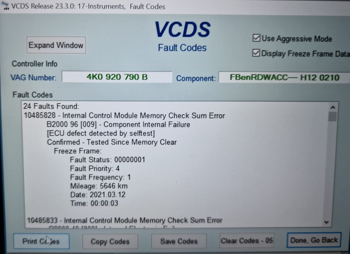 10485828 - Internal Control Module Memory Check Sum Error
