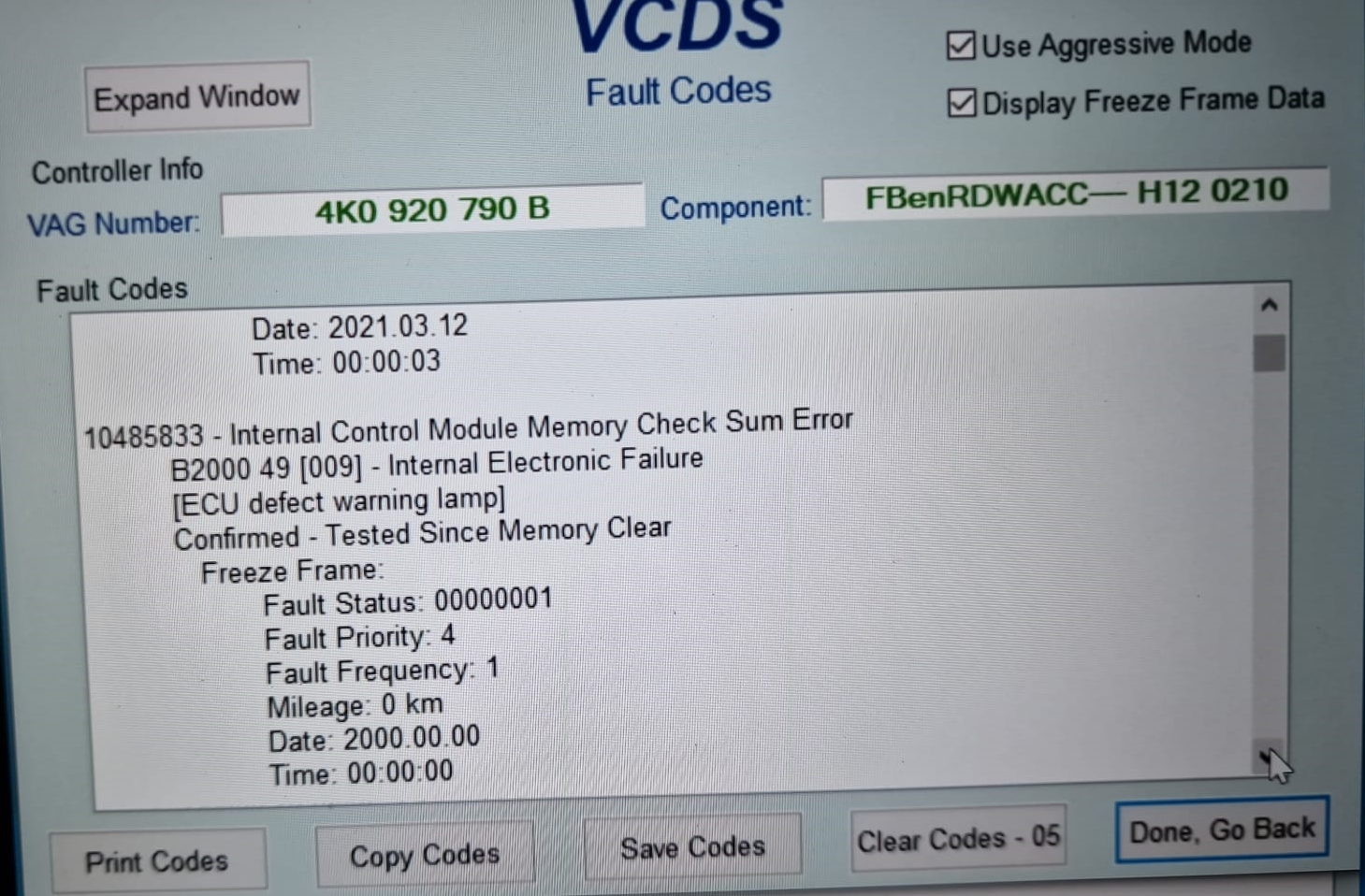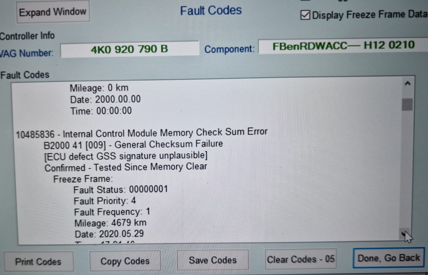 Internal control module checksum memory error - B2000